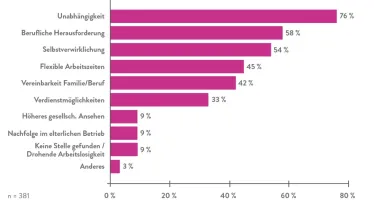 Warum sich Frauen selbstständig machen: Die Studie „Gründerinnen im Handwerk“ der Fachhochschule Mittelstand (FHM) hat mit weitem Abstand den Wunsch nach Unabhängigkeit als Treiber ausgemacht, die Gründe „berufliche Herausforderung“ und „Selbstverwirklichung“ folgen auf den Plätzen.