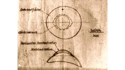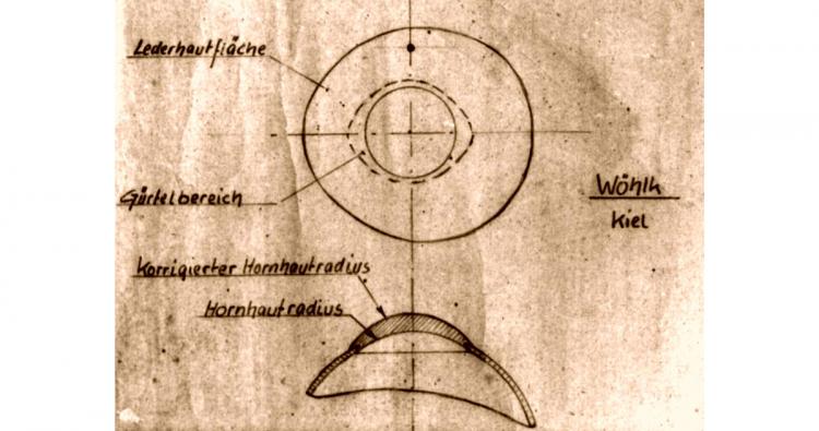 Der Verzweiflung nahe, setzt sich Heinrich Wöhlk 1947 nur den optischen Teil einer Skleralschale aufs Auge: zwölf Millimeter im Durchmesser, die Randbereiche bearbeitet und verrundet.