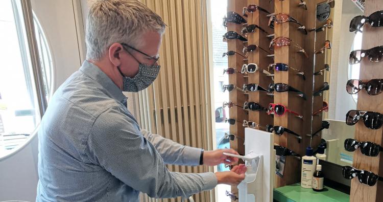 Alexander Lehr, Inhaber von Optik Lehr in Mainz-Laubenheim, desinfiziert sich die Hände. Seine Kunden müssen klingen, bevor sie Einlass erhalten.