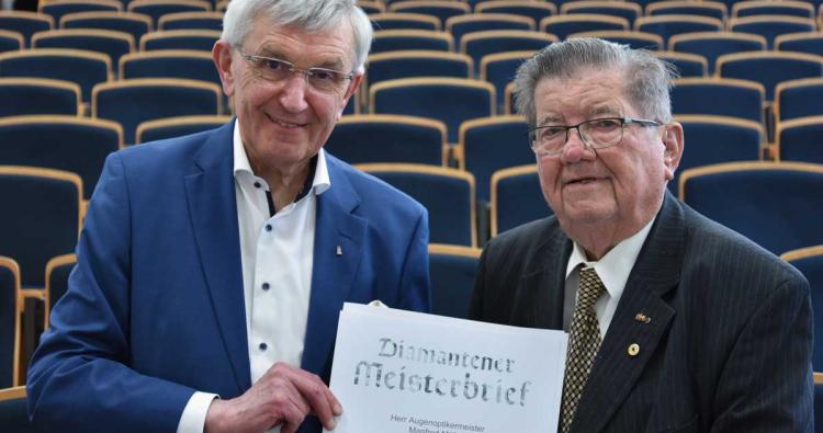 Gerd Kurt Schwieren (l.), ehemaliger Obermeister der Augenoptikerinnung Köln, überreicht Manfred Leo Müller den "Diamantenen Meisterbrief".