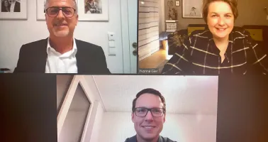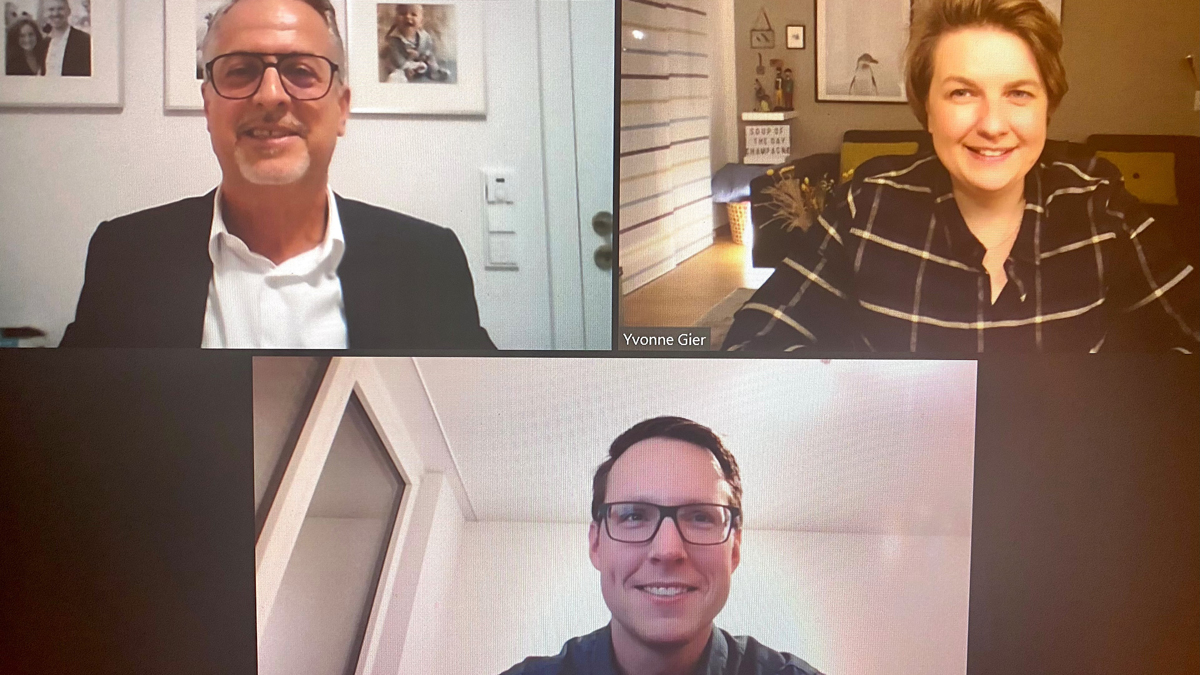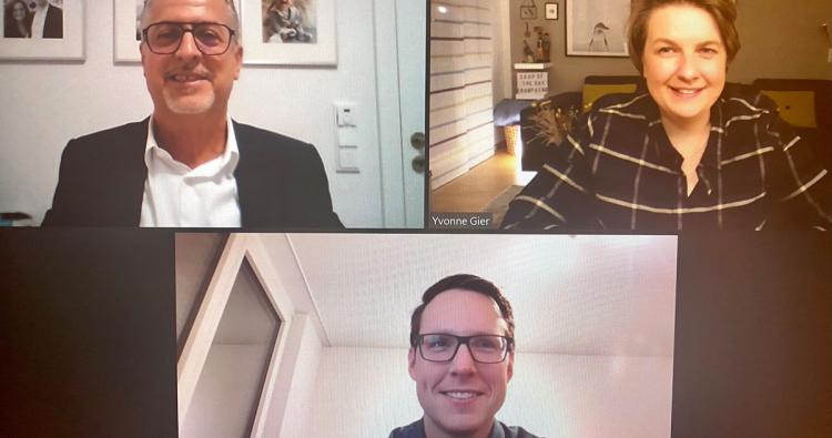 Der Stifter Karl Amon (l. o.) gemeinsam mit den Preisträgern Yvonne Gier und Tobias Bracher beim digitalen Austausch