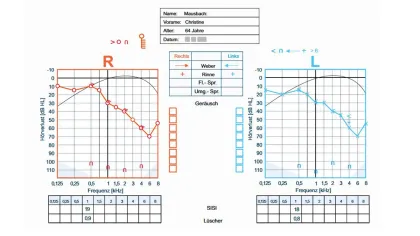Christine Mausbach betreibt zur Weihnachtszeit einen Lebkuchenstand am Dresdner Striezelmarkt (Foto oben). Im Sommer verkauft sie Süßigkeiten auf diversen Volksfesten. Insbesondere wenn die laute Musik des Kinderkarussells einsetzt oder die Glocken der Frauenkirche läuten, hat sie in letzter Zeit zunehmend Probleme, die Wünsche ihrer Kunden zu verstehen. Daher entschied sie sich zu einem Besuch bei ihrem HNO-Arzt, der neben Stimmgabelversuchen, einer otoskopischen Untersuchung und einem Sisi-Test zudem eine Ton- sowie eine Sprachaudiometrie durchführte. Er diagnostizierte aufgrund der Ergebnisse eine beidseitige mittlere Schallempfindungsschwerhörigkeit und stellte ein Rezept für zwei Hörgeräte aus (Abb. 1).