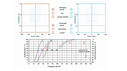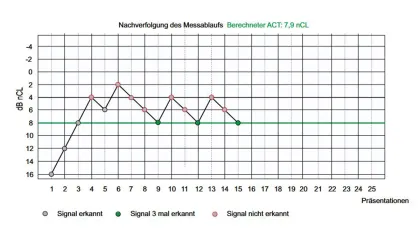 Der per Messungen errechnete ACT-Wert (Abb. 3) beträgt 7,9 dB nCL. Dies entspricht gemäß den normativen Daten einem mäßigen Kontrastverlust (7 - 10 dB nCL). Bei diesem Ergebnis wird empfohlen, die adaptiven Parameter der Störschallreduzierung auf ein mittleres Niveau einzustellen.