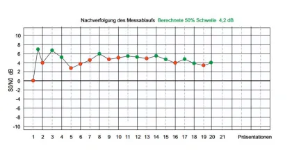 Für den Januar hat Christine Mausbach einen Termin bei Hörakustik Bäumlein (Name vom Autor geändert; Anm. d. Red.) bekommen. Bei der Anpassung wurde die für den Beruf besondere Bedeutung des Verstehens im Störschall thematisiert. Besonders problematisch ist die Tatsache, das Nutz- und Störschall nahezu aus der gleichen Richtung kommen. Neben der üblichen Audiometrie führte der Experte einen ACT-Test sowie einen Göttinger Satztest (GÖSA) im Störschall ohne Hörgeräte mit S0N0 durch.