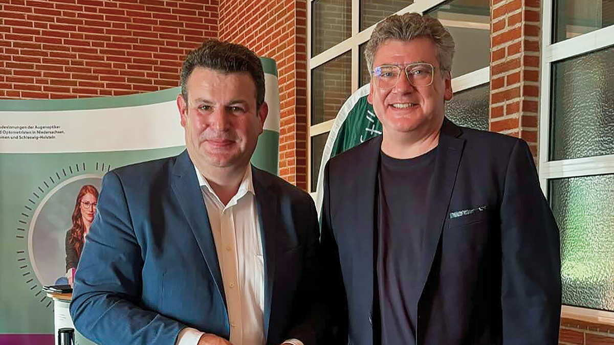 Giovanni Di Noto (r.), Obermeister der Landesinnung der Augenoptiker und Optometristen in Niedersachsen und Bremen, und Bundesarbeitsminister Hubertus Heil beim Besuch der Fachakademie in Hankensbüttel.