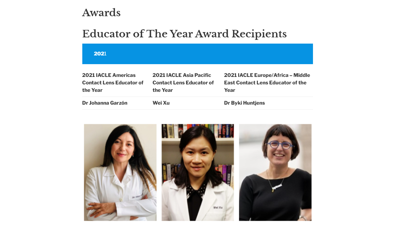 Die International Association of Contact Lens Educators (IACLE) bietet Ausbilderinnen und Ausbildern im Bereich Kontaktlinse die Chance, im Rahmen der Auszeichnung zum "IACLE Contact Lens Educator of the Year" zu einer internationalen Tagung zu reisen. Die Awards werden an drei Personen vergeben - aus Amerika, Asien und Europa / Afrika - Naher Osten. In diesen drei Regionen ist die IACLE global tätig.