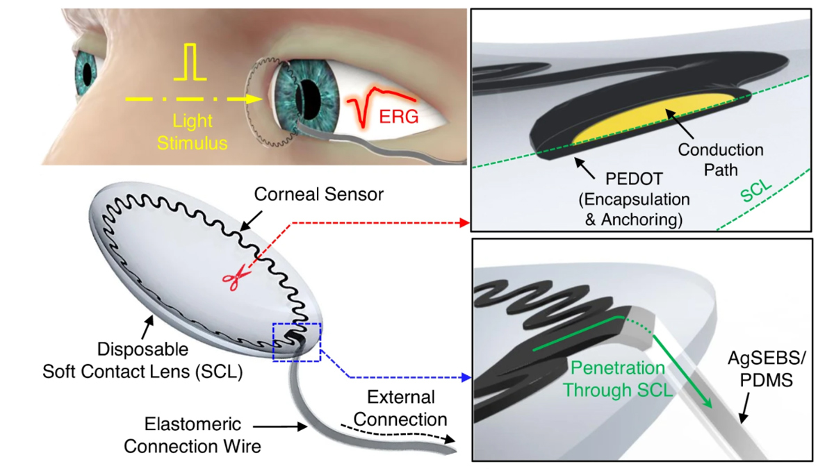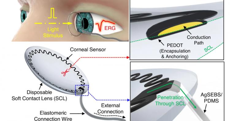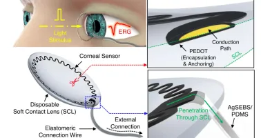 Wie andere „intelligente“ Kontaktlinsen erfassen auf den weichen Kontaktlinsen eingebettete Biosensoren die elektrophysiologische Aktivität der Hornhautoberfläche. Mit einem Unterschied anscheinend: Die ultradünnen Biosensoren sind auf die Aktivität der Netzhaut ausgerichtet und dehnbar, wodurch sie besser mit der gebogenen Form kommerzieller weicher Kontaktlinsen kompatibel sein sollen und den Patientenkomfort erhöhen.