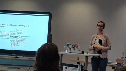 Neben Vorträgen zu u.a. MKH bei Schulkindern und Grundlagen der Funktionsprüfung kamen in diesem Jahr einige Bachelor- sowie Master-Absolventinnen und Absolventen zu Wort, die ihre Arbeiten zum Thema Binokularsehen und MKH vorstellen durften. Loreen Roth, Preisträgerin des Rupp + Hubrach-Preises, präsentierte ihre Bachelorarbeit „Tiefenmechanismus vs. Gesamtheit der Tiefenmechanismen“. Neben selbst konzipierten Tests zeigte ihre Arbeit, dass die aktuellen Vorgaben für die Stereogrenzwinkel in einigen Berufsgruppen eher zufällig zustande kamen. Die Ergebnisse legen nahe, dass trotz höherer Stereogrenzwinkel die Tests gegebenenfalls mit mehr Zeit fehlerfrei zu bestehen sind. Als Fazit der Untersuchung erklärte Roth, dass künftig Forschungen stärker auf die Anforderungen einzelner Tätigkeiten ausgerichtet und entsprechend relevante Stereogrenzwinkel definiert werden müssten. Roth meinte, wenn das Thema vertieft und zumindest berufsspezifisch klassifiziert würde, wäre das bereits ein Schritt in die richtige Richtung.