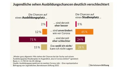 Laut den Ergebnissen einer repräsentativen Jugendbefragung des Marktforschungsinstitutes iconkids & youth sorgt sich die Mehrheit der Jugendlichen um ihre berufliche Zukunft. Demnach seien 71 Prozent der 1.743 Befragten und damit zehn Prozent mehr als im Vorjahr der Ansicht, dass sich die Chancen auf einen Ausbildungsplatz durch Corona verschlechtert haben. Bei Jugendlichen mit niedriger Schulbildung seien es sogar 78 Prozent.