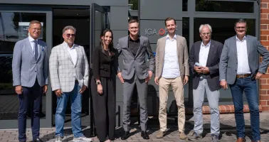 Gruppenfoto nach der Vorstandssitzung: (v.l.) Notar Dr. Thomas Hölscher, Dirk Vorpahl (als Vertreter des Aufsichtsrates), Katharina Trabert, der neue Prokurist Kai Muth, Matthias Hippich, Klaus Hogrebe und Geschäftsführer Carsten Schünemann.