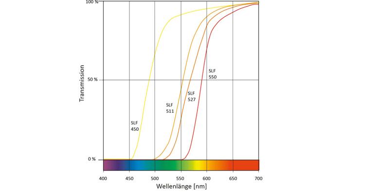 Kantenfilter werden häufig auch als „Blue-Blocker“ bezeichnet, weil sie sowohl UV-Strahlung als auch kurzwelliges, blaues Licht bis zu einer bestimmten, definierten Kante absorbieren. Bild 1 zeigt Beispiele dieser stark ansteigenden Transmission mit dem charakteristischen Kurvenverlauf.
