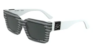 Auch das Modell KL6182S sorgt für Aufsehen: Diese Sonnenbrille aus hochwertigem Acetat ist für Damen und Herren geeignet und fällt durch ihr gestreiftes Finish sowie die geometrische Form ins Auge. Ein edles Detail ist die emaillierte Metallplakette mit dem Karl-Autogramm an den Bügeln. Erhältlich ist sie unter anderem in Blau gestreift, Schwarz und dunklem Schildpatt.