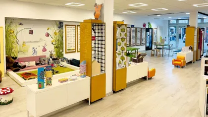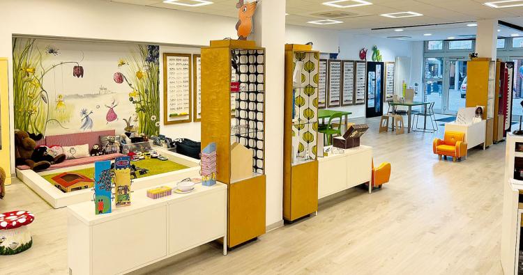 Dieser Blick in den Verkaufsraum von Optik Kruse zeigt den Kinderbereich namens „Lucki Gucki“ - sehr frei wohl am besten mit „Fröhliches Sehen“ zu übersetzen.
