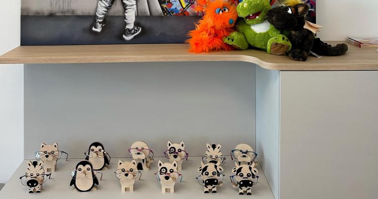Doch wer jetzt in ein buntes Kinderparadies zu blicken glaubt, wenn er nach den 25 Treppenstufen die Tür zum Refraktionsraum öffnet, der irrt gewaltig. Natalizi hat ihr klares Inneneinrichtungskonzept aus dem Laden mit weißen Wänden, Holztischen und -regalen im Kinderrefraktionsraum fortgeführt. Lediglich der bunte Teppich in der Nähe des Refraktionsstuhls, die Handpuppen – Fuchs Erika und die Drachen Felix Ferdinand und Hans – auf einem Regal und die niedlichen kleinen Brillenständer in Zebra-, Pinguin-, Bären- und Hundeform darunter lassen erahnen, dass es sich um eine Kinderstube handelt. Es sind wenige Geräte zu sehen und auch Spielzeug sucht man zumindest auf den ersten Blick vergeblich. Natalizis Devise: „Wir sind kindgerecht eingerichtet, aber wir sind kein Kindergarten. Wir wollen Kinderoptometrie machen und nicht die ganze Zeit spielen“. Dennoch dürfen die Kinder – im Gegensatz zu den anderen Räumen im Betrieb – alles anfassen und Schubladen oder Schranktüren öffnen. Kleine Ausnahme: die Geräte. Zwar ist die Vielzahl der Messinstrumente ohnehin mobil und meist nur für die Optometristin greifbar im Rollcontainer verstaut, aber wenn im Laufe der Untersuchungen doch das ein oder andere Gerät und Messinstrument auf dem Tisch oder der Fensterbank liegt, dann setzt die Augenoptikerin klare Grenzen und sagt unmissverständlich, „die Geräte sind meine und dürfen nur von mir bedient werden.