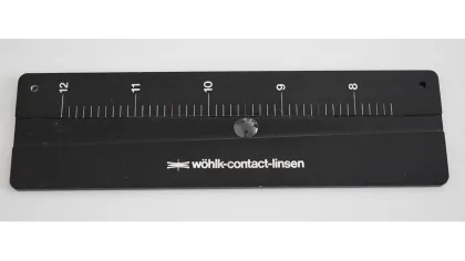 Viel weniger fehleranfällig ist die Anwendung einer sogenannten V-Kanal-Lehre. Hier lässt man die Kontaktlinse in den konisch gearbeiteten, mit einer Skala versehenen Kanal der Messlehre gleiten und liest an der Stelle, an der die Kontaktlinse stecken bleibt, den Durchmesser ab. Keinesfalls jedoch sollte versucht werden, die Kontaktlinse manuell im Kanal weiter zu schieben, da hierdurch schnell Randdefekte auftreten können. Eine weitere Option ist die Verwendung einer Messlupe oder eines Kontaktlinsenmikroskops mit integrierter Skala. Die Kontaktlinse wird einfach auf die Skala des Mikroskops oder der Lupe gelegt, die Optik scharfgestellt und der Durchmesser abgelesen.
