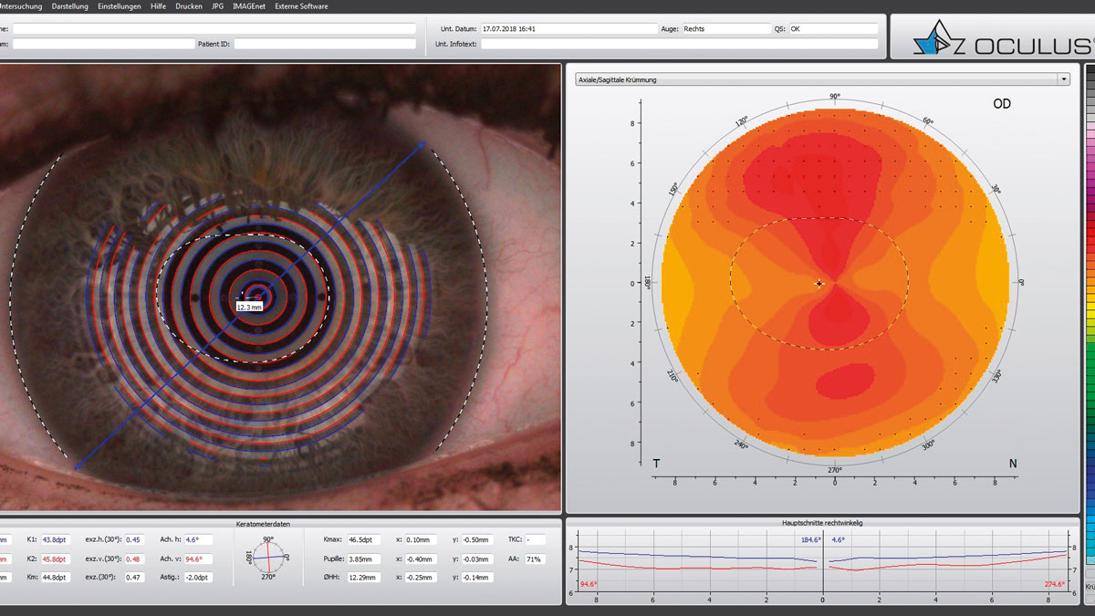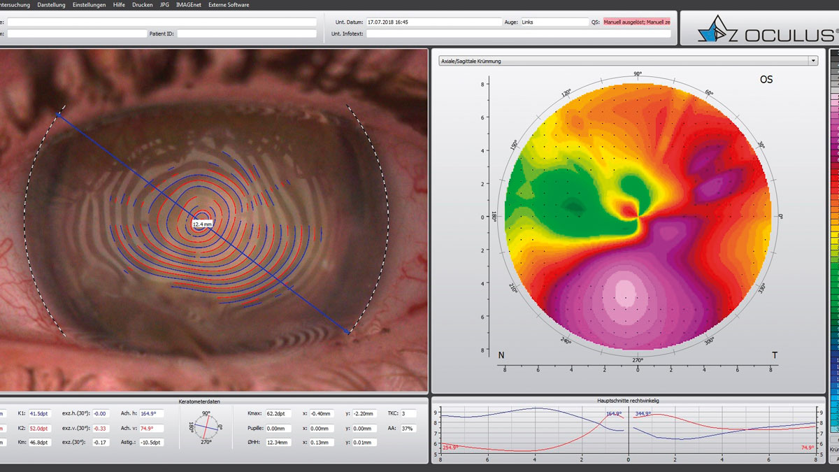 Die Topographie zeigte auf dem rechten Auge einen regelmäßigen Astigmatismus rectus in Höhe von 2,00 dpt bei durchschnittlichen Hornhautradien. Es war zu erwarten, dass die Topographie für das geschädigte linke Auge kaum oder nur schwer zu messen ist. Die besten Ergebnisse waren durch zusätzliche Gabe von Benetzungstropfen zu erzielen. Dennoch waren verwertbare Daten nur auf einer Zone von 37 Prozent (AA – analyzed area) messbar, die kaum Anhaltspunkte für die folgende Anpassung der Irislinse liefern. Daher wurden die geometrischen Daten vom Gegenauge für die Anpassung einbezogen.