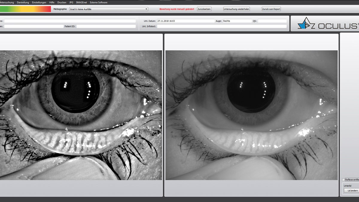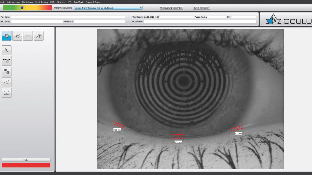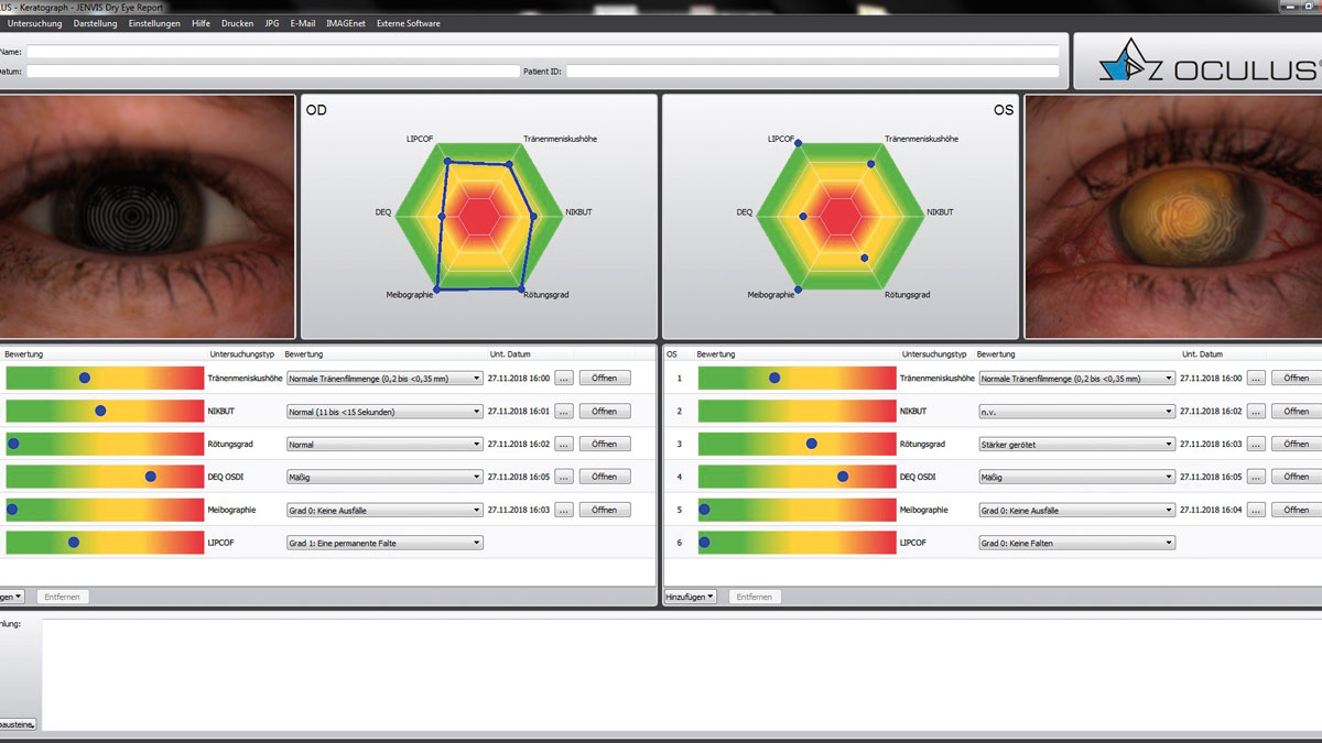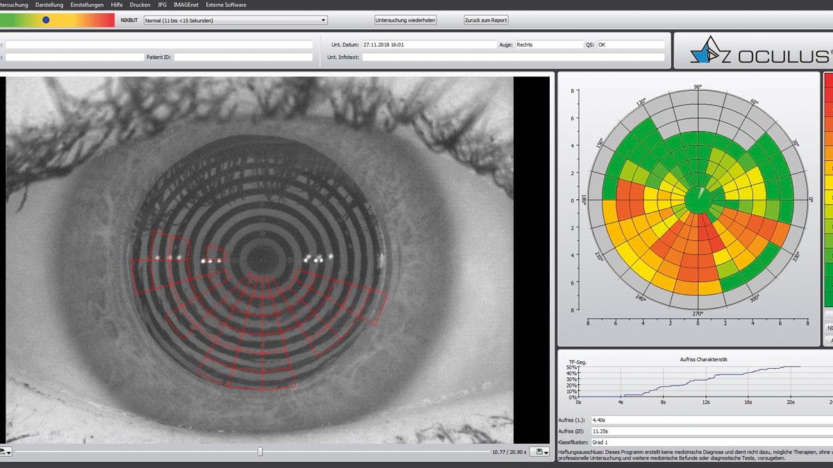 Nach der Anamnese erfolgte die ausführliche Tränenfilmanalyse. Die Auswertung des JenvisDry-Eye-Reports ergab einen als physiologisch normal einzuschätzenden Tränenfilm. Eine leichte Auffälligkeit zeigte die Auswertung des Dry-Eye- Fragebogens (OSDI-Dry Eye Fragebogen), bei dem subjektiv einige Anzeichen des Trockenen Auges angezeigt wurden. Auch die nicht-invasive Tränenfilmaufreißzeit (NIKBUT-Test) zeigte eine leichte Auffälligkeit (klassifiziert mit Grad 1). Alle weiteren Tränenfilmteste zeigten keine Auffälligkeiten.