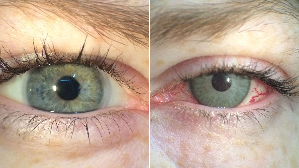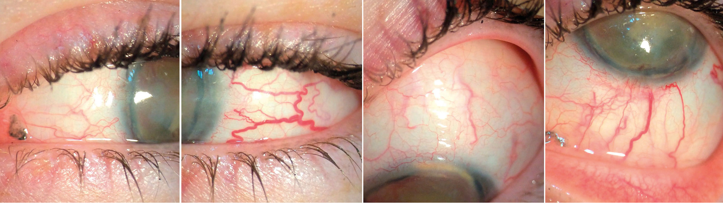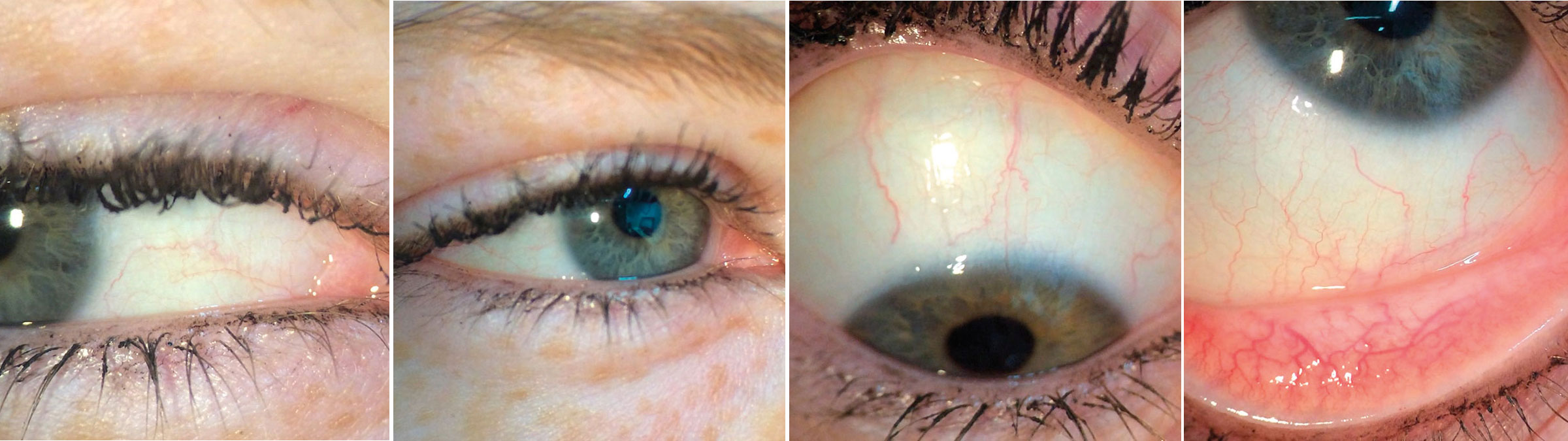 Die Bindehaut des linken Auges wurde trotz der hier vorliegenden prominenten Blutgefäße ähnlich dem rechten Auge klassifiziert. Wichtig ist die Unterscheidung zwischen den leicht verschiebbaren Gefäßen der bulbären Bindehaut und tieferliegenden, nicht verschiebbaren skleralen Gefäßen. Die dickeren, skleralen Gefäße täuschen einen höheren Rötungsgrad vor, müssen aber beim Grading der Bindehautrötung ignoriert werden, da es sich nicht um Bindehautgefäße handelt.