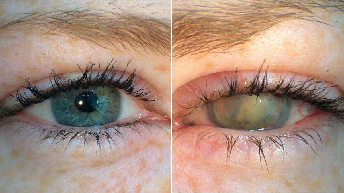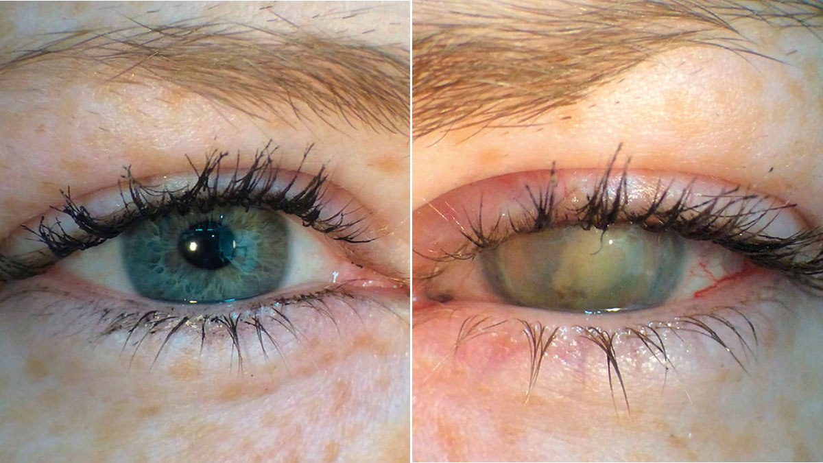 Bis 2011 trug Frau D. T. weiche Kontaktlinsen (CooperVision: Biofinity, BC 8,60, sph -3,50dpt, DIA 14,00, beidseits im regelmäßigen Austausch). 2011 wurde eine Katarakt-OP infolge einer Vitrektomie des linken Auges durchgeführt. Wenige Monate später erfolgte auf dem rechten Auge ebenfalls eine Katarakt-OP. Im Folgejahr wurden beide Augen einer Laser-OP des Nachstars unterzogen. Auch weitere Operationen konnten eine Erblindung des linken Auges nicht verhindern. Die Hornhaut hatte ihre Transparenz verloren und das Auge ist kosmetisch entstellt.