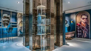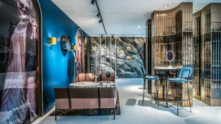 In dieser reizstarken Umgebung komme der Beleuchtung die wichtige Aufgabe zu, die Qualitäten von Materialien und Oberflächen herauszuarbeiten und "den Raum zu strukturieren und den Blick zu lenken", so der Eigner weiter. Das neue Interieur überrasche mit einem "eklektischen Stil- und Materialmix". Dazu gehören altrosa Polstermöbel, preußischblaue Wände, mit goldglänzenden Kacheln geflieste Säulen im Zentrum des Raums sowie eine Seitenwand, die wie ein roher Fels aus Beton gestaltet wurde.