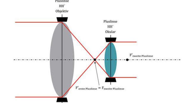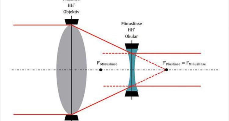 Beim Galilei-Fernrohr ist das Objektiv eine Sammellinse und das Okular eine Zerstreuungslinse. Die Brennweite der Zerstreuungslinse ist kleiner als die der Sammellinse. Der okularseitige Brennpunkt der Pluslinse und der objektivseitige Brennpunkt der Minuslinse fallen zusammen.