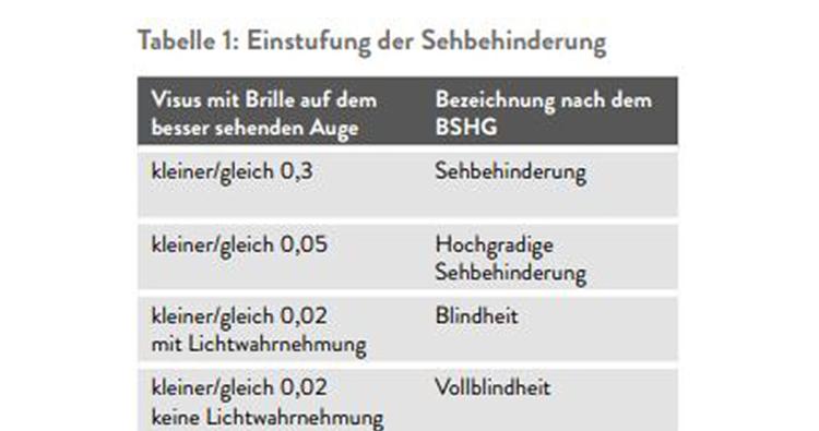 Nach der Versorgungsmedizinischen Verordnung wird zwischen Sehbehinderung, hochgradiger Sehbehinderung und Blindheit unterschieden (siehe Tabelle 1). Gesichtsfelddefekte (z.B. Hemianopsie, vergrößerter blinder Fleck, Zentralskotom, tunnelförmige Einschränkung des peripheren Gesichtsfelds) beeinflussen zusätzlich den Grad der Sehbehinderung. [1-3]