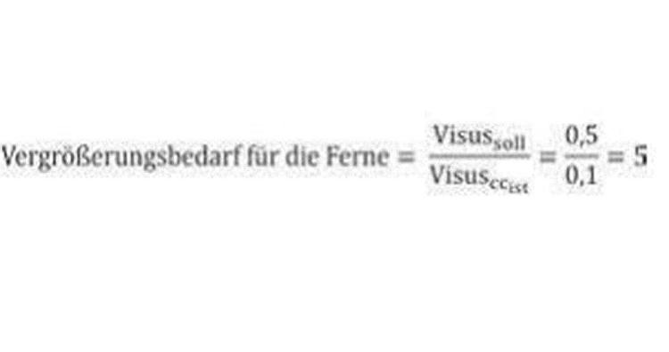 Wenn der Visus cc bekannt ist, kann der Vergrößerungsbedarf ermittelt werden. Um am sozialen Leben teilnehmen zu können, ist es für Sehbehinderte wichtig, die Tageszeitung, Broschüren, den Beipackzettel von Medikamenten oder Formulare lesen zu können. Auch das Fernsehen, Kartenspielen mit Freunden oder Handarbeiten tragen zum allgemeinen Wohlbefinden und dem gesellschaftlichen Dazugehören bei. Im Optimalfall wird bereits während der Anamnese die Haupt-Wunschentfernung festgelegt.