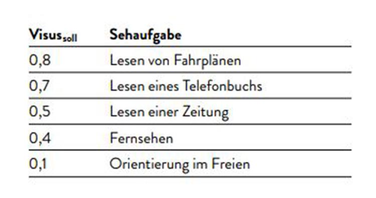 Der Visusbedarf (Visussoll) richtet sich nach der Sehaufgabe. [4]