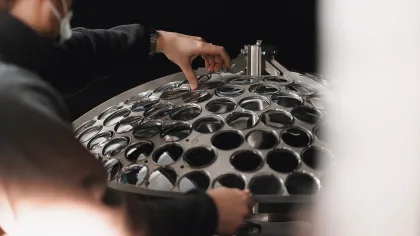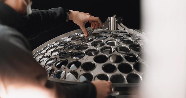 Der energieintensivste Schritt bei der Brillenglasherstellung ist die Beschichtung. Mit Hilfe sogenannter Kalotten werden die benötigten Veredelungen in Hochvakuum-Beschichtungsanlagen aufgedampft.