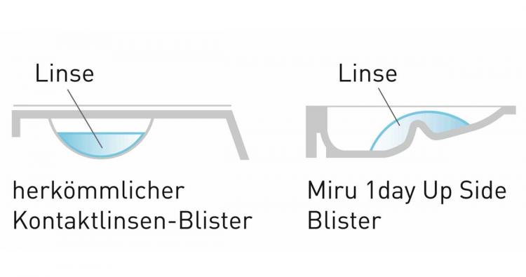 Ein Vergleich mit dem herkömmlichen Kontaktlinsenblister zeigt den Vorteil des bei der Miru 1Day UpSide verwendeten Blister.