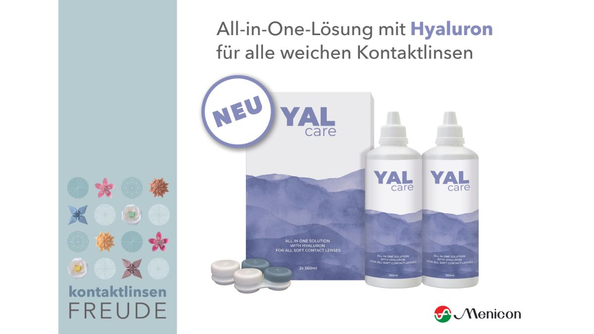 Mit YALcare führt Menicon eine neue All-in-One-Lösung mit Hyaluron ein. Das Produkt ist zum Reinigen, Desinfizieren, Aufbewahren, Abspülen und Benetzen aller weichen Kontaktlinsen, einschließlich farbiger Kontaktlinsen geeignet und verhindere Proteinablagerungen. Die Benetzungsstoffe Hyaluron und HEC sollen für einen hohen Komfort und eine langanhaltende Benetzung sorgen. Ein antibakterieller Behälter schütze vor mikrobieller Verunreinigung. Das Produkt ist im Doppelpack á 2x 360ml sowie als 100 ml Reise-Set ab sofort in Deutschland, Österreich und der Schweiz erhältlich.