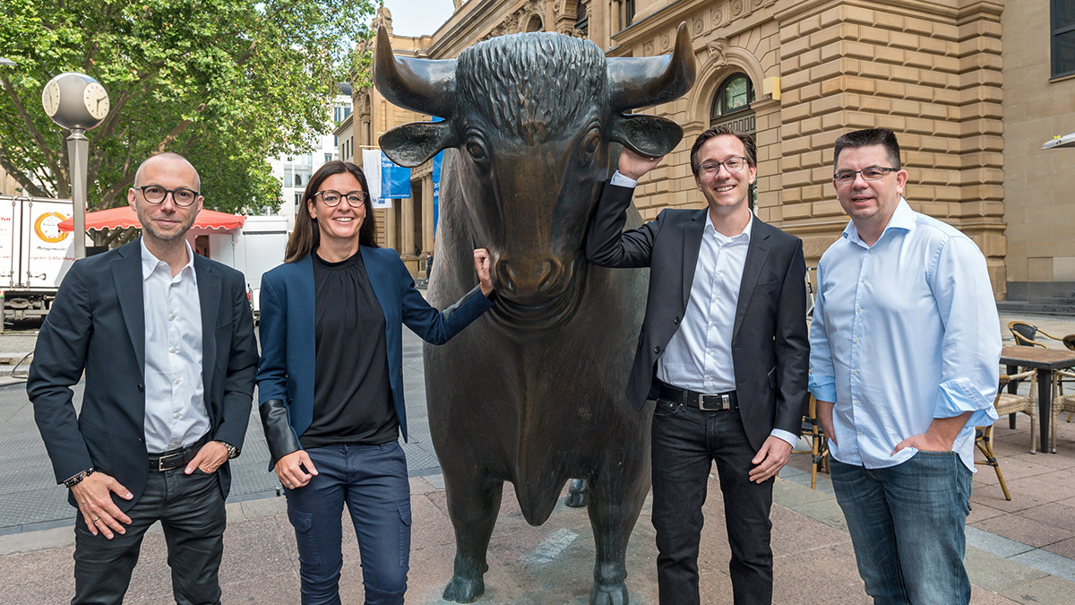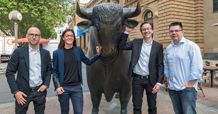 Der Vorstand der Mister Spex SE am Tag des Börsengangs: (v. l.) Co-CEO Mirko Caspar, Maren Kroll, Chief Human Resources Officer, Dr. Sebastian Dehnen, Chief Financial Officer, und Co-CEO Dirk Graber.