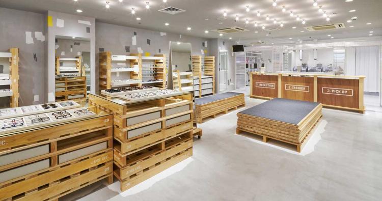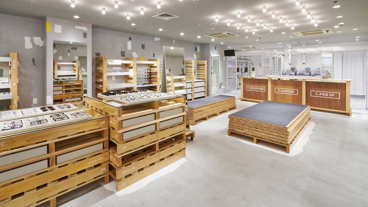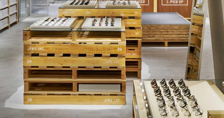 Für ein unprätentiöses und kreatives Corporate Design wurde bei J!NS in Tokio aus klassischen Holzpaletten ein ganzes Ladenbau-Programm konzipiert.