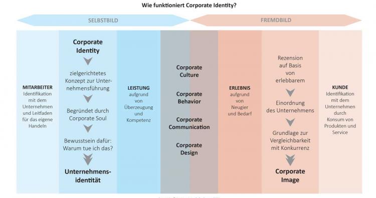 Übersetzt bedeutet Corporate „Unternehmen, Körperschaft oder Firma“ und Identity „Identität“. Wer jetzt denk: „Klar, Corporate Identity und Unternehmensidentität ist dasselbe“ liegt allerdings falsch, denn Corporate Identity beschreibt ein vollumfängliches Konzept mit strategischen Maßnahmen, das zum Ziel hat, eine Unternehmensidentität herauszuarbeiten. Diese Identität ist allerdings nur ein Selbstbild des Unternehmens, das erst durch konsequente Kommunikation nach außen in den Köpfen der Kundinnen und Kunden zu einem Unternehmensimage wird. Dieses Image verleitet Kundinnen dazu, sich durch den Konsum von Produkten und Services mit dem jeweiligen Unternehmen verbinden zu wollen (siehe Grafik). Klingt verwirrend? Bleiben Sie dran: Ich verspreche, es ist im Grunde simpel!