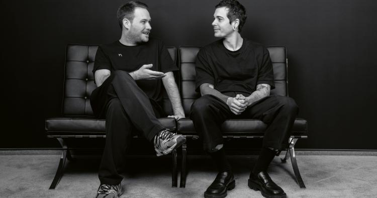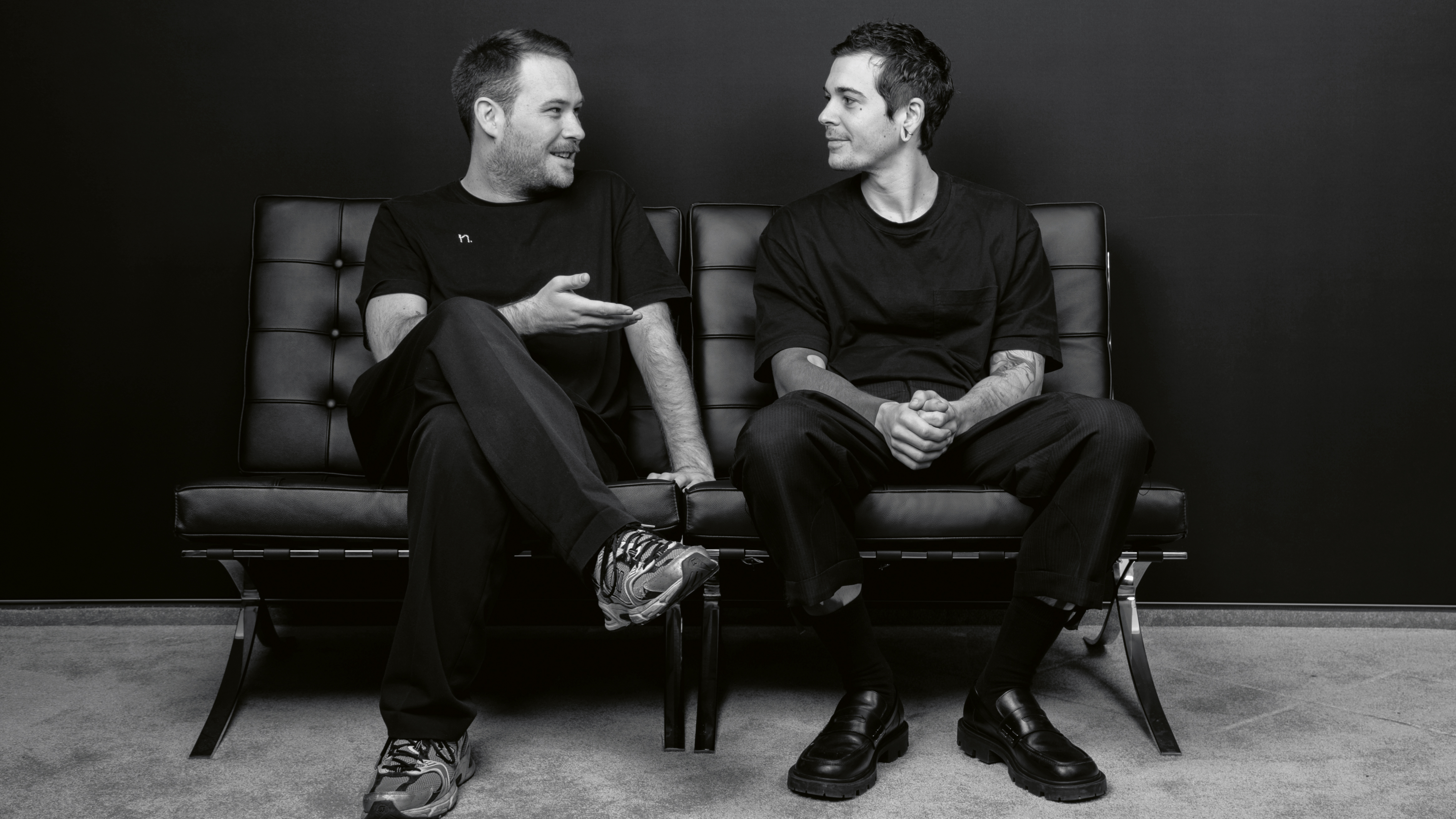 (Foto links) Vor kreativen Herausforderungen: Die Designer Gabriel Kirschner (rechts im Bild) und Michael Hüyng. Ihre Brillenkreationen für Neubau Eyewear verbinden technische Innovation und fortschrittliche Ästhetik.