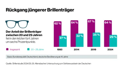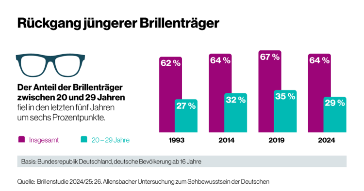 Erstmals seit 2004 ist der Anteil der Brillenträger in Deutschland leicht gesunken – von 67 Prozent im Jahr 2019 auf nunmehr 64 Prozent. Dies geht aus der aktuellen Brillenstudie des Instituts für Demoskopie Allensbach hervor, die im Auftrag des Kuratoriums Gutes Sehen (KGS) entstanden ist. Dies sei vor allem auf einen Rückgang der gelegentlichen Brillenträger zurückzuführen, deren Zahl unter anderem aufgrund wirtschaftlicher Unsicherheiten und steigender Lebenshaltungskosten zurückgehe. Doch während weniger Menschen gelegentlich eine Brille tragen würden, bleibe der Anteil der konstanten Brillenträger stabil. Besonders auffällig: Der Anteil der 20- bis 29-Jährigen, die eine Brille tragen, ist laut Studie von 35 auf 29 Prozent gesunken. Viele dieser jungen Erwachsenen greifen vielleicht bewusst weniger zur Brille oder verzichten sogar ganz darauf.