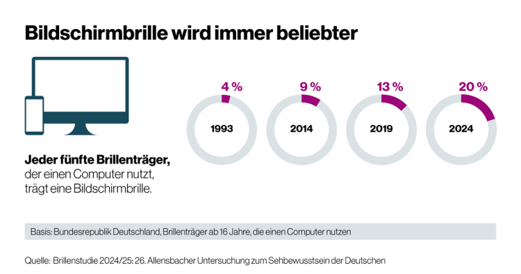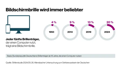 Mit der zunehmenden Nutzung von Smartphones, Tablets und Computern änderten sich auch die Anforderungen an gutes Sehen. Bereits jeder fünfte Fehlsichtige nutze eine spezielle Bildschirmbrille, und 22 Prozent aller Brillenträger griffen auch für ihre digitalen Geräte zur Brille. Bei den Gelegenheitsnutzern steige dieser Anteil sogar auf 31 Prozent.