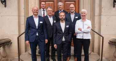 Die zur Mitgliederversammlung Anwesenden des neuen SPECTARIS-Vorstands: (v.l. vorne) Roland Dimbath, Mathis Kuchjeda, Dr. Sebastian Braun-Lüdicke, Inga Kuhls, (v.l. hinten) André Schulte, Josef May, Dr. Thomas Renner.