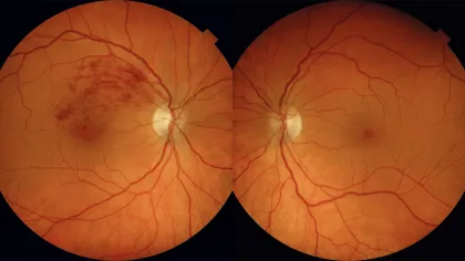 Bei der anschließenden Fundusaufnahme zeigte sich allerdings etwas Unerwartetes. Rechts streifige, flammenförmige Blutungen im Bereich oberhalb der Makula sowie ein zartes Makulaödem; zudem links leichte Gefäßveränderungen.