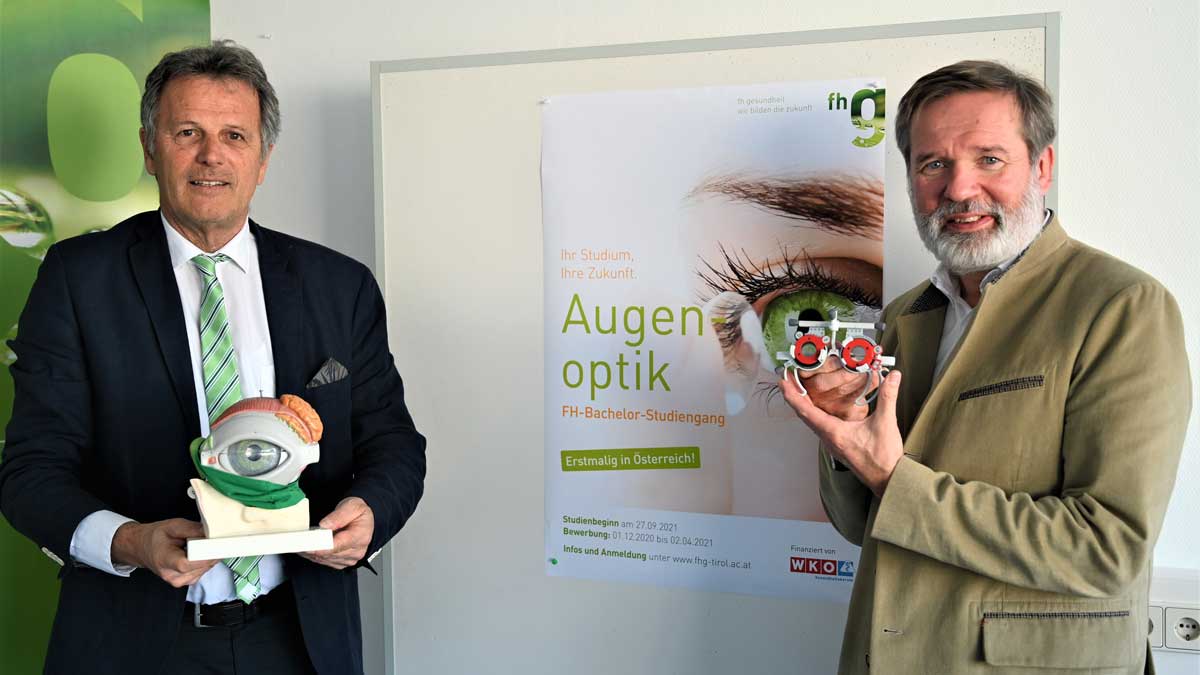 Walter Draxl (l.), Geschäftsführer FH Gesundheit, und Studiengangsleiter Gustav Pöltner freuen sich über die Akkreditierung des ersten Augenoptik-Studiums in Österreich.