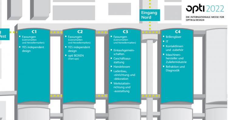 Dabei sind die Hallen C1 und C2 des Messegeländes in München Riem den Brillenfassungskollektionen der Lizenz- und Herstellermarken sowie der so bezeichneten YES independent design Area, einer zusammenhängenden Fläche für „innovative Eyewear-Labels“, vorbehalten. Ebenfalls als Teil der YES independent design Area präsentieren sich in der Halle C2 die Start-ups der Branche, in den von vergangenen Messen bekannten Opti-Boxen. In Halle C3 werden ebenfalls Fassungen präsentiert, aber auch die Bereiche Ladenbau und Ladeneinrichtung sowie Dekoration, Werkstatteinrichtung und -ausstattung, Handelsware, Pflege- und Reinigungsprodukte, Vitrinen, Displays, Marketing und Geschäftsausstattung. In der C4 präsentieren sich schließlich die Hersteller von Brillengläsern, Kontaktlinsen, Geräten, Instrumenten sowie Maschinen.