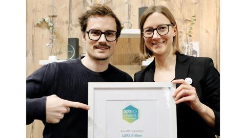 Stolz halten sie die Urkunde des „Opti Box Award” in die Höhe: Silvia Nadenbousch und Simon Krähenbühl, die frisch gekürten Co-Founder des Berner Start-ups. Ihre ganzheitliche Vision der Brille und ihres Unternehmens überzeugten die Fachjury.