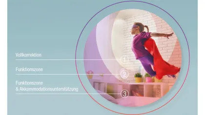 Zur Entwicklung des Brillenglases schloss man sich mit den spanischen Brillenglasdesignern von IOT zusammen und hielt sich dabei an die technischen Vorgaben des renommierten Brien Holden Vision Instituts (BHVI). Entsprechend enthält Smyle essenzielle Features aus der jahrelangen Forschungsarbeit des BHVI und die Technologie wurde offiziell lizenziert. Das Glas ist in drei verschiedene Zonen unterteilt. Scharfe Sicht in allen Distanzen bietet der eiförmige, zentral vollkorrigierende Bereich mit einer horizontalen Größe von 7 mm. Angrenzend folgen zwei Technologiezonen, deren Besonderheit darin liegt, dass die Anordnung auf die natürliche Asymmetrie der Netzhaut abgestimmt ist. Der periphere Behandlungsbereich besteht aus einem asymmetrischen horizontalen myopischen Defokus mit einer Addition von +1,50 dpt bei 25 mm nasal und +1,80 dpt bei 25 mm temporal. Zusätzlich weist das Glas einen myopischen Defokus inferior mit einem Wert von +2,00 dpt auf. Mit dem peripheren Defokus soll das Augenwachstum verlangsamt und mit der integrierten Addition gleichzeitig die Akkommodation unterstützt werden. Dank der Smyle-Freeform-Technologie sind die Brillengläser nach außen hin nicht von normalen Einstärkengläsern zu unterscheiden.