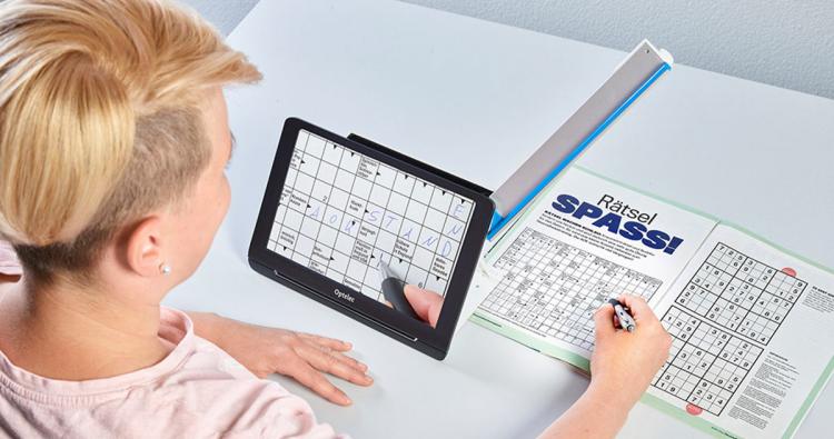 Der HD-Touch Bildschirm hat eine Bildschirmdiagonale von 24,5 cm und kann mit 16 Farbkombinationen in bis zu 22-facher Vergrößerung dargestellt werden. Mit der Speech-Version können die Texte in 30 Sprachen vorgelesen werden. Unter dem ausklappbaren Kameraarm können Schriftstücke beschrieben werden, da sie gleichzeitig am Bildschirm wiedergegeben werden. Mit der sogenannten „Free Write“- Funktion kann eine ganze DIN A4 Seite dargestellt werden. Der wiederaufladbare Akku hat eine Laufzeit von bis zu 3,5 Stunden und kann mit der mitgelieferten Transporttasche mobil eingesetzt werden.