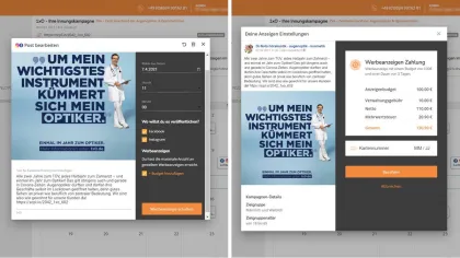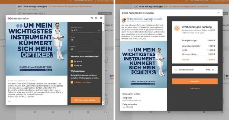 Links: Einzelne Posts können als Facebook-, Instagram- oder Google-Anzeige geschaltet werden. Rechts: Es wird eine zehnprozentige Verwaltungsgebühr erhoben und die Bezahlung erfolgt per Kreditkarte.