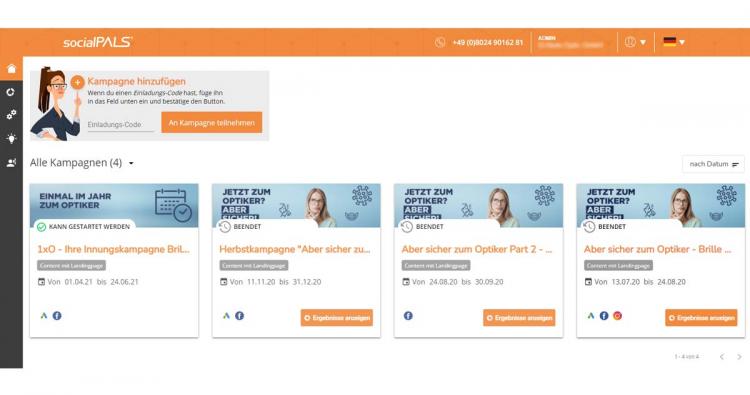 Auf dem Dashboard, der Übersichtsseite, werden die unterschiedlichen Kampagnen, zu denen die Partneroptikerinnen und Partneroptiker eingeladen wurden, angezeigt.
