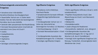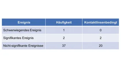 Bei der sechs Jahre laufenden OH-Studie wurden keine schwerwiegenden unerwünschten Ereignisse gemeldet. 93 Prozent der unerwünschten Ereignisse wurden als nicht signifikant eingestuft und 45 Prozent aller Vorkommnisse, die das Auge betrafen, standen nicht im Zusammenhang mit dem Kontaktlinsentragen. [2] Eine detaillierte Übersicht bietet Tabelle 2.