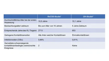 Durch retrospektive Untersuchungen zweier multizentrischer Studien zur Wirksamkeit von weichen Kontaktlinsen konnte die Häufigkeit schwerwiegender kontaktlinsenbedingter unerwünschter Ereignisse, wie zum Beispiel mikrobielle Keratitis, in der Altersgruppe der Acht- bis Zwölfjährigen bestimmt werden. [1,2] Dazu wurden die Daten von 963 (nachfolgend ReCSSStudie) [1] und 144 (nachfolgend OH-Studie) [2] Kindern analysiert, die über einen Zeitraum von sechs Jahren Kontaktlinsen trugen. Als Bewertungsgrundlage dienten die Kriterien aus Tabelle 1.