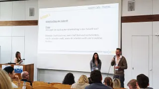Anschließend wurden die Studierenden in fünf Gruppen aufgeteilt und sollten jeweils eine zentrale Fragestellung mit Antwortmöglichkeiten herausarbeiten. Zu diesem Zweck bekamen sie große Papierplakate und bunte Eddingstifte. Nach eineinhalb Stunden gab es für alle erst einmal Mittagspause und nach Nikolaus Reuters Vortrag zum Thema: „Was erwartet Bachelor-/Masterabsolventen der Augenoptik/Optometrie auf dem Arbeitsmarkt?“ begann das Symposium, bei dem die Studierenden ihre Lösungen präsentieren durften.