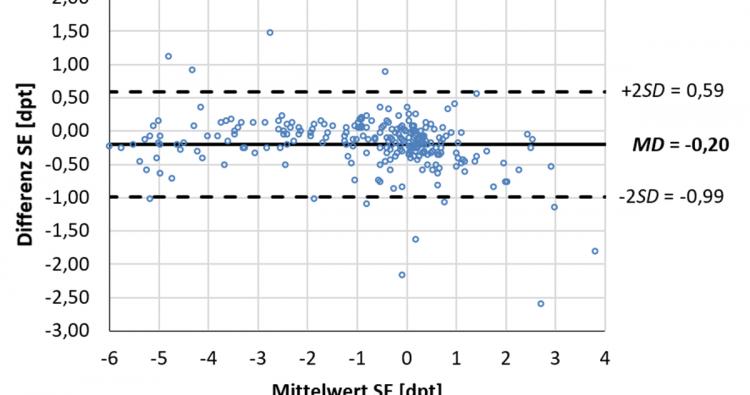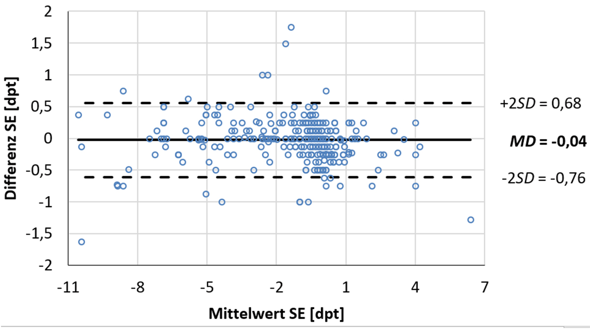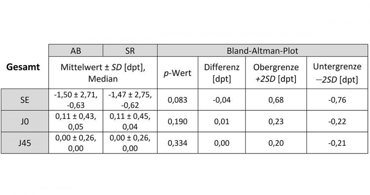 In der Gesamtgruppe betrug das SE im AB-Modus −1,50 ± 2,71 dpt und im SR-Modus −1,47 ± 2,75 dpt. Es konnte kein signifikanter Unterschied festgestellt werden (p = 0,083). In Abbildung 3 (s. Bildergalerie) werden die Daten in einem Bland-Altman-Plot dargestellt. Vielmehr zeigt sich eine sehr starke positive Korrelation (r = 0,98), (Abb. 4; s. Bildergalerie). Es wurde eine mittlere Differenz von −0,04 dpt, mit einer Obergrenze von 0,68 dpt und einer Untergrenze von −0,76 dpt ermittelt. In Tabelle 1 werden zusätzlich die J0- und J45Ergebnisse gegenübergestellt, die ebenfalls keine signifikanten Differenzen aufweisen.